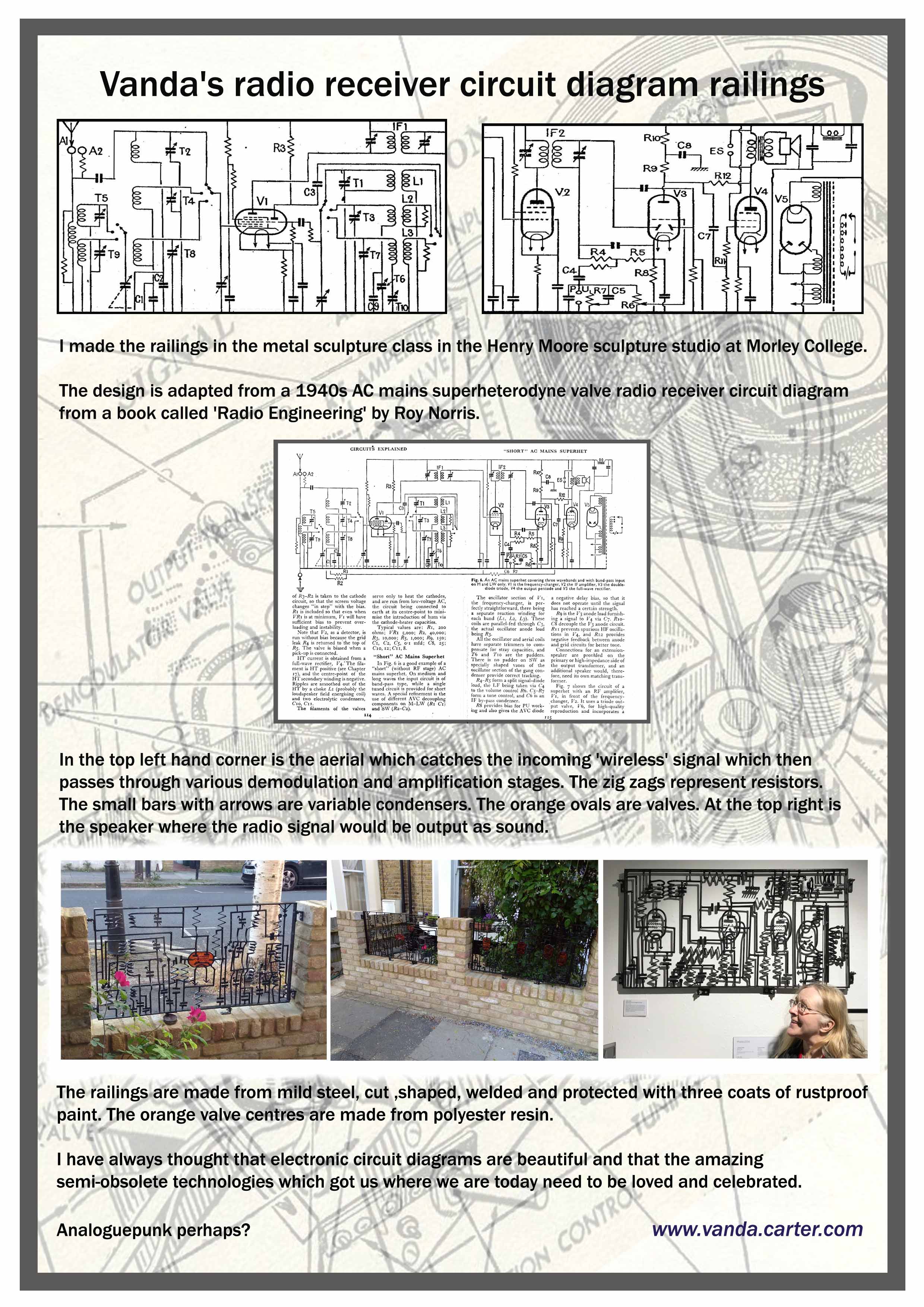 My front garden railings. The design is based on a 1940s AC mains superheterodyne valve radio receiver circuit diagram. I have always thought electronic circuit diagrams are beautiful and that the amazing superceded technologies which got us where we are today need to be celebrated.